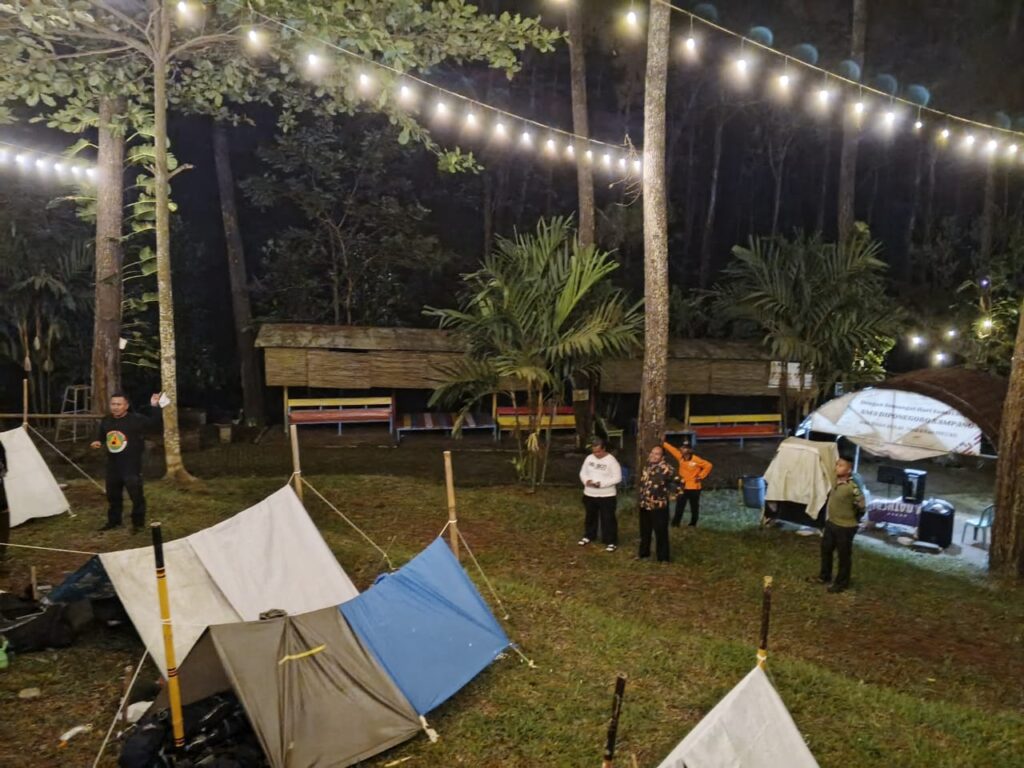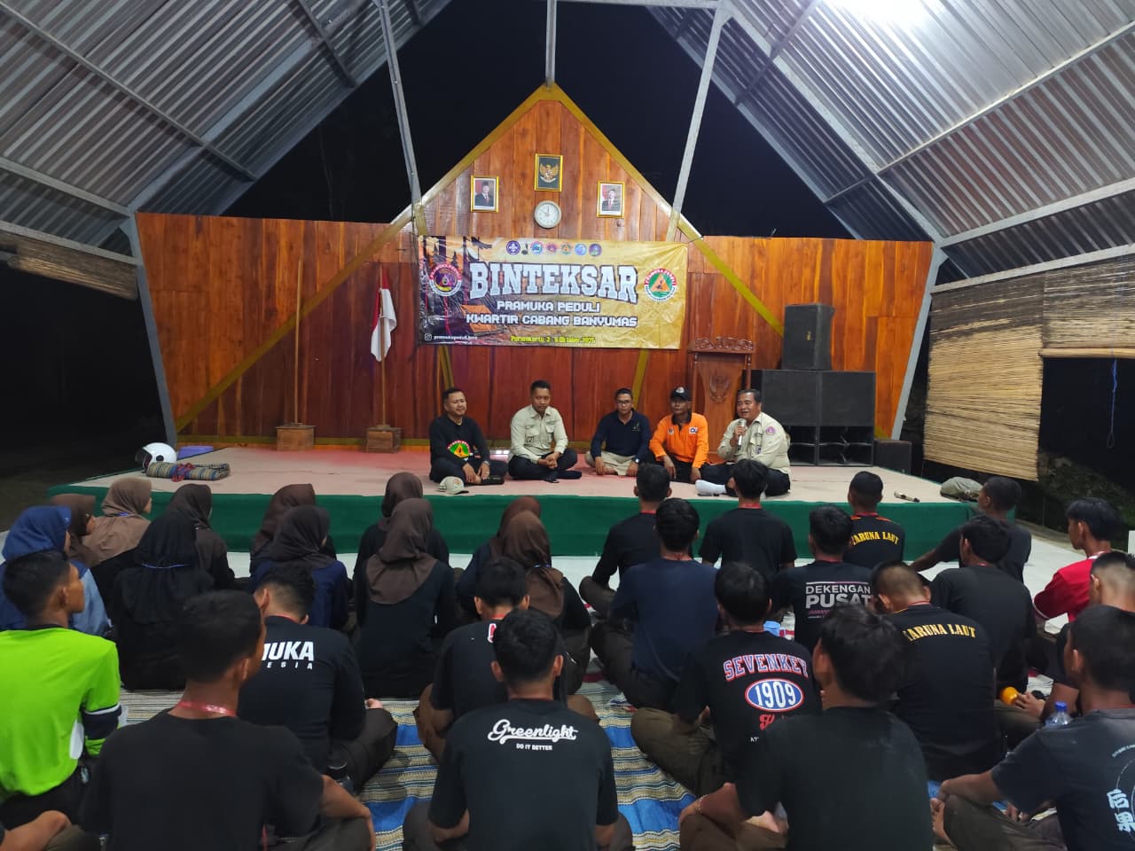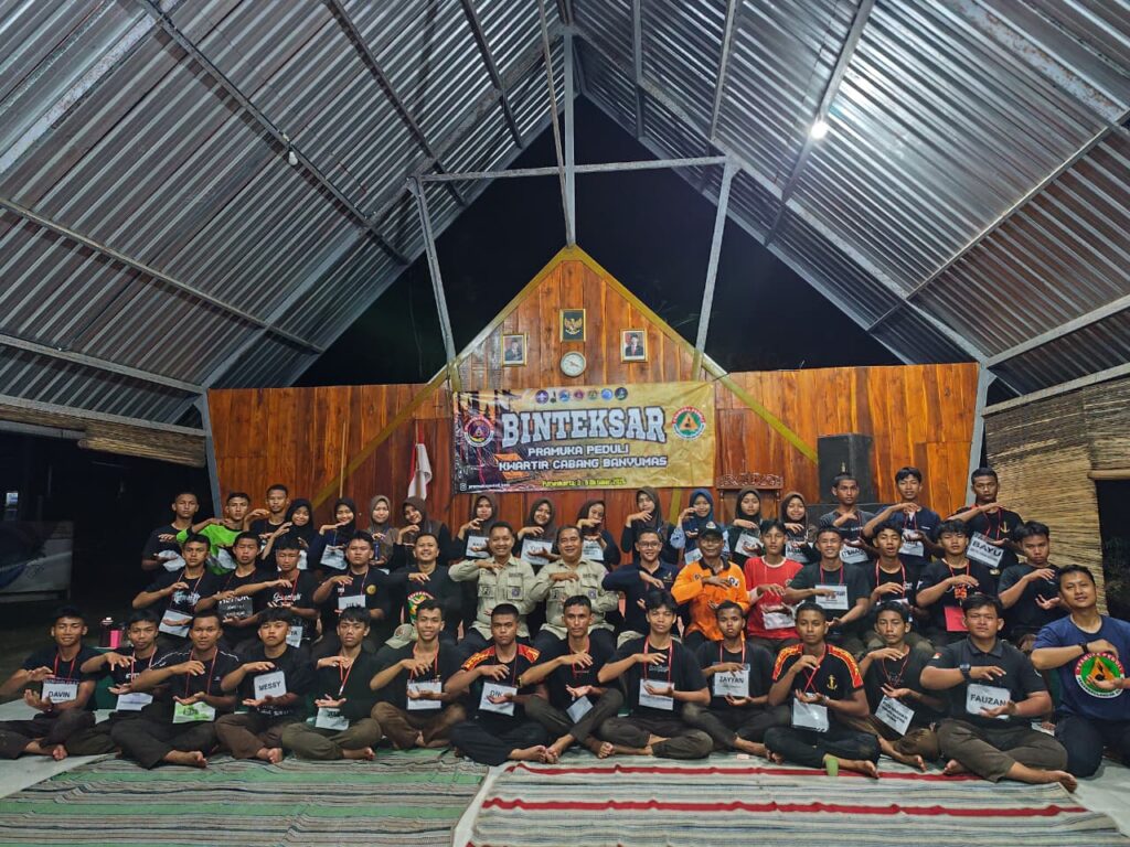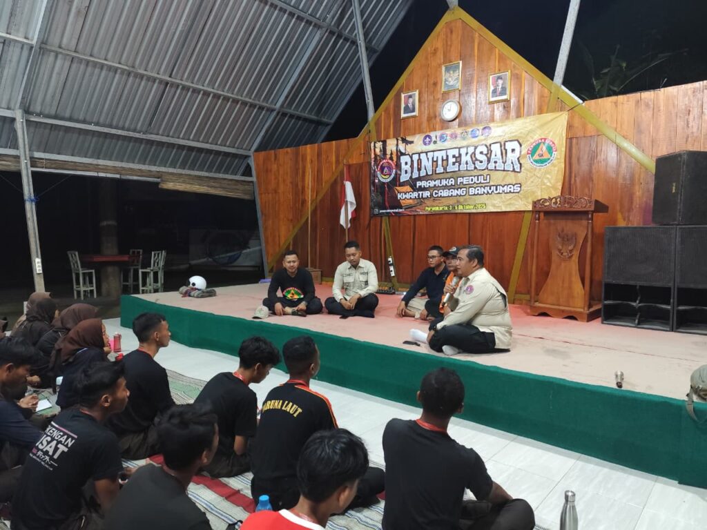 Sekretaris I Kwartir Cabang Banyumas, Kak Wahyu Handoko, memberikan materi penguatan dan motivasi kepada para peserta Bimbingan Teknis (Bintek) SAR Pramuka Peduli. Agenda Sarasehan tersebut diselenggarakan pada Sabtu malam, 4 Oktober 2025, bertempat di kawasan Curug Song, Kebasen.