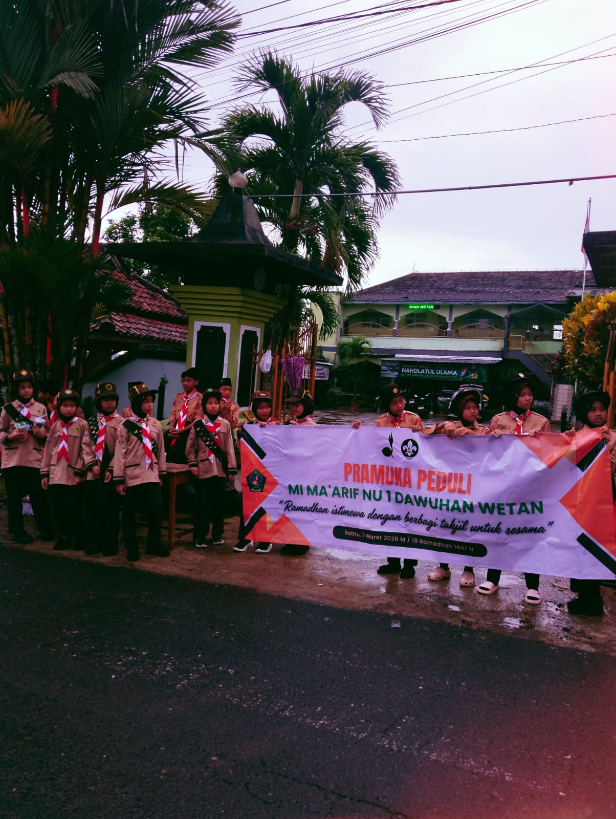 Semangat kepedulian sosial ditunjukkan oleh puluhan anggota Pramuka dari MI Ma’arif NU 1 Dawuhan Wetan. Bertepatan dengan malam ke-17 Ramadhan 1447 H atau Sabtu, 7 Maret 2026, mereka menggelar aksi simpatik berupa pembagian 300 paket takjil gratis kepada warga dan pengguna jalan di sekitar wilayah Dawuhan Wetan, kecamatan Kedungbanteng.